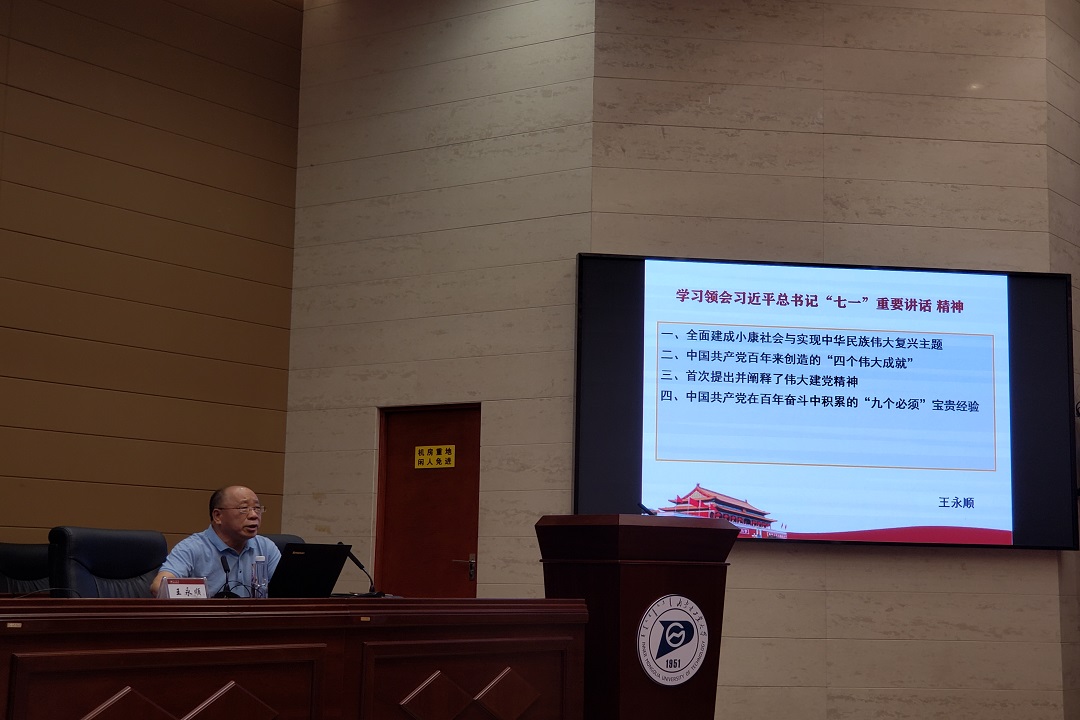 王永顺教授从“全面建成小康社会与实现中华民族伟大复兴主题”“中国共产党百年来创造的‘四个伟大成就’”“首次提出并阐释了伟大建党精神”“中国共产党在百年奋斗中积累的‘九个必须’宝贵经验”4个方面,对习近平总书记“七一”重要讲话精神进行了精彩解读和阐释。