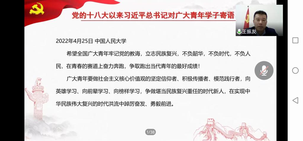 王振友强调,作为新时代青年,要努力学习知识技能,时刻牢记党的教诲,牢记习近平总书记的殷殷嘱托,坚定理想信念,以饱满的热情投入学习工作中,以实际行动迎接党的二十大胜利召开。