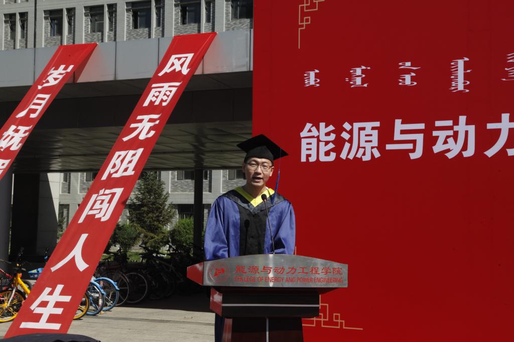 经理孟克其劳向所有获得博士、硕士、学士学位的毕业生表示祝贺。他回顾了在校期间同学们学习、生活的美好时光和所成得的成绩,勉励同学们要志存高远,勇担时代重任;要勇于拼搏,积聚“动能”;要拓展格局,胸怀家国。将“博学躬行,尚志明德”的校训、“厚德博学,自立自强”的院训和“唯实尚行”的校风传承和发扬下去,将家国情怀融入个人事业之中,将个人理想融入党和国家的事业之中,为党、为国家、为人民多作贡献。并祝福同学们在新的征程,取得更加辉煌的成绩,乘风破浪,前程万里!