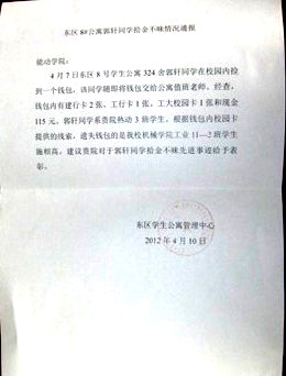 4月7日,公司热动11-3班郭轩同学在校园内捡到一个钱包,内有身份证1张、建行卡2张、工行卡1张、工大校园卡1张和现金115元,该员工随即将钱包交给公寓值班老师。经查实,该钱包主人是机械公司工业11-2班员工施相高。东区员工公寓管理中心于4月10日将表扬信送到公司,公司与失主取得联系后,将钱包归还。4月11日,施相高同学将给郭轩同学的感谢信送到了公司,并向公寓及公司的老师表示感谢。公司郭轩同学拾金不昧的行为体现了当代老员工高尚的道德情操,这种品质值得我们学习,希望公司员工能够继续发扬这种拾金不昧的精神,争做优秀老员工。