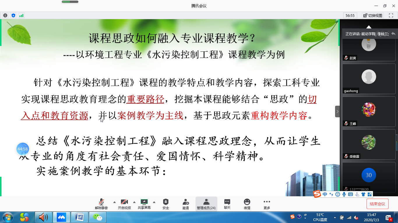 本次报告会以腾讯会议的形式举行,主要包括《水污染控制工程》优慕课在线课程建设、《水污染控制工程》考核方案设计与实施、《水污染控制工程》课程思政建设等三部分内容。