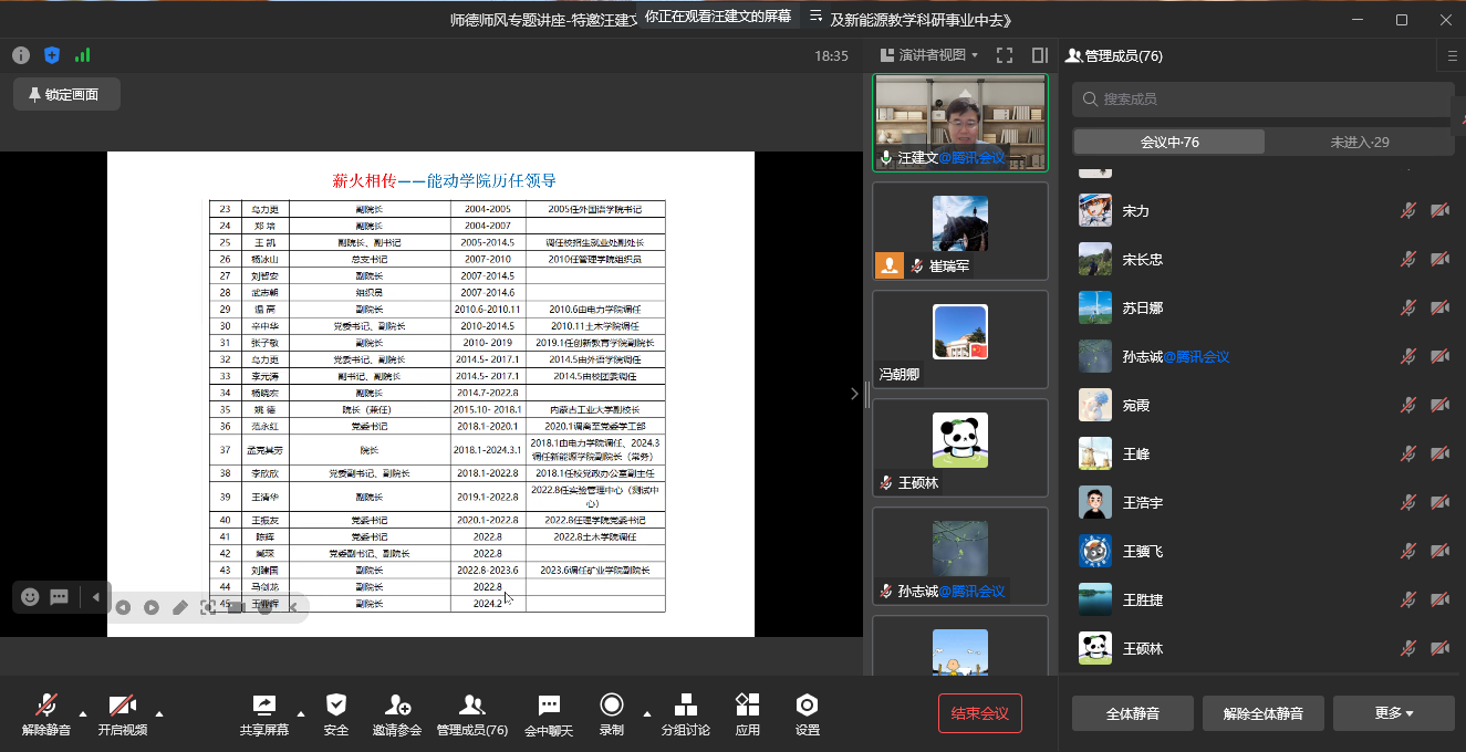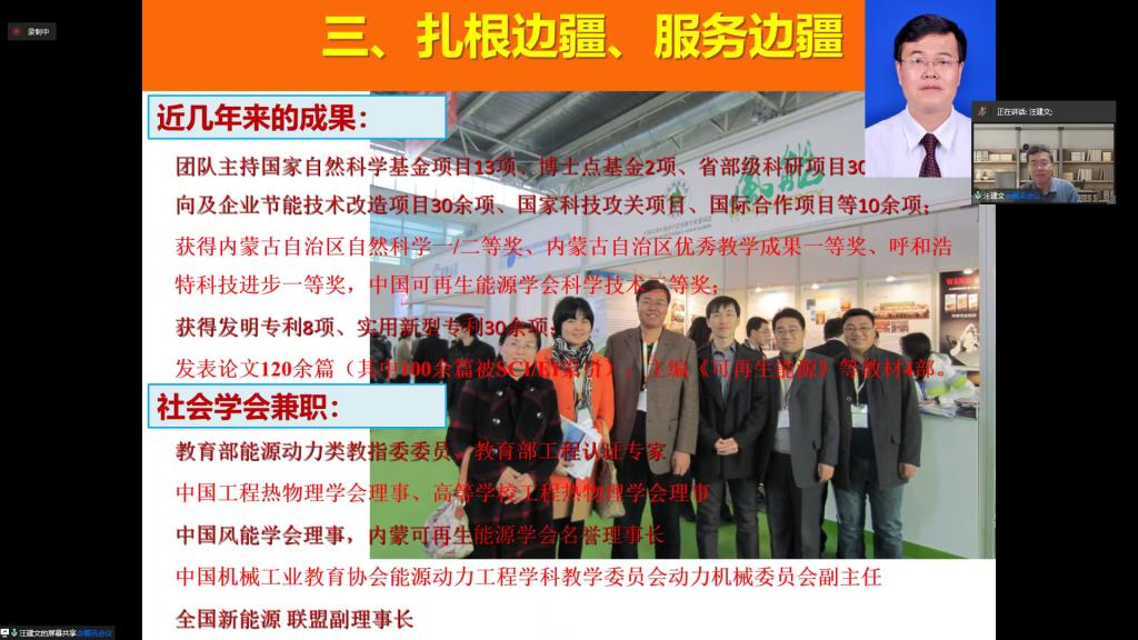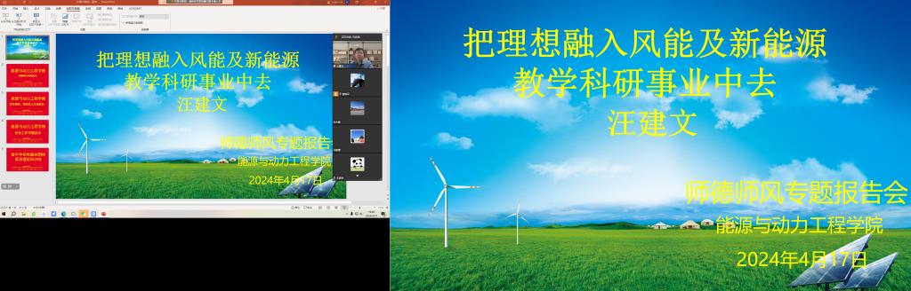 4月17日晚,公司在线上举行师德师风专题讲座,特邀汪建文教授以“把理想融入风能及新能源教学科研事业中去”为主题,与全院教职工共同探讨和分享教学科研的深层次内涵。此次讲座旨在进一步强化公司的师德师风建设,深入践行社会主义核心价值观,激励教师们自觉提升师德修养,积极投身于教书育人的伟大事业中,传承和发扬能动精神。