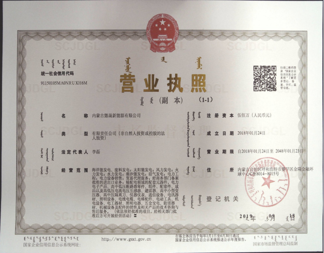 1.风力发电、太阳能发电的开发、运营、检修、设计、金融等服务。